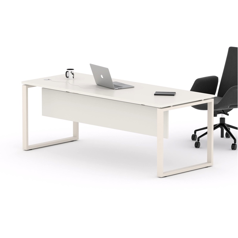 Mesa para oficina fabricada en tablero melaminizado con cantos en PVC, montado sobre estructura de patas y bastidores metálicos.