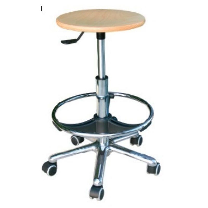 Taburete con asiento en madera de haya barnizada. Parte infereior cromada. Elevación por piston a gas. Aro reposa pies ajustable en altura